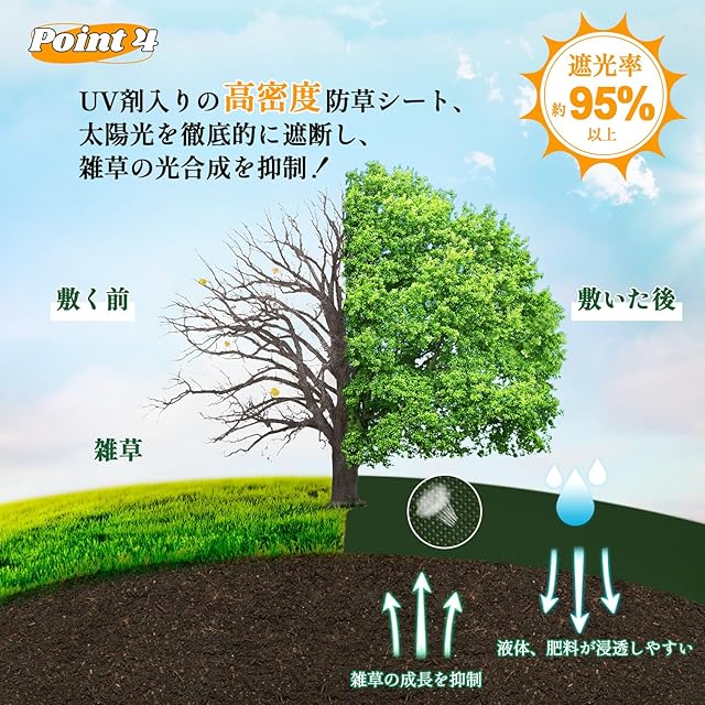 【高透水性&UV耐候性で長期間エコフレンドリー】高い密度でありながら、水は通し、空気は逃がす特殊な構造。除草シートを通して雨水や液肥はしっかり透過させるため、植物の根腐れや土壌の乾燥を防ぎます。さらに、厳選されたUV耐候剤を配合し、日本の厳しい日差しからシートを強力に保護。劣化を大幅に抑え、環境にも配慮した持続可能な雑草対策として、美観を長期的に保ちます。