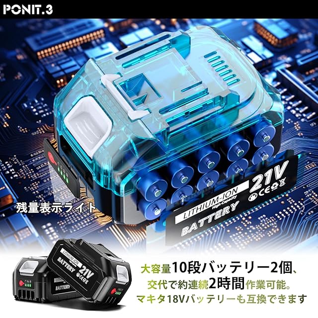 【大容量バッテリー2個/残量表示LEDライト】大容量リチウムバッテリー2個を付属する電動ヘッジトリマーです。使用場所を選ばず、フル充電されたバッテリー1個分の作業時間は約1時間ほど、2個交代で2時間連続作業可能。マキタ18Vバッテリー(BL1820b、BL1830、BL1840、BL1850、BL1860B)と互換性があり、バッテリーに残量表示ライトがついていますので、作業時間を把握できます。