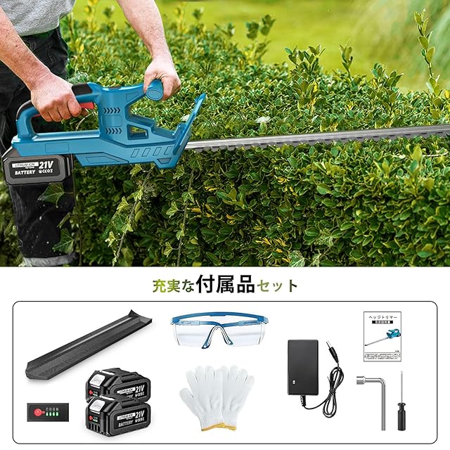 【付属品とアフターサービス】付属品:ヘッジトリマー本体x 1、ブレード収納ケースx 1、大容量リチウムバッテリーx 2、充電器x 1、保護メガネx 1、手袋x 1、ドライバーx 1、レンチx 1、日本語取扱説明書x 1 。出荷前に厳格な品質検査を行われますが、万が一、お手元に届いた商品に欠陥がある場合は「注文履歴」➡「出品者に連絡する」。担当者が24時間以内返信し、真摯に対応いたします。