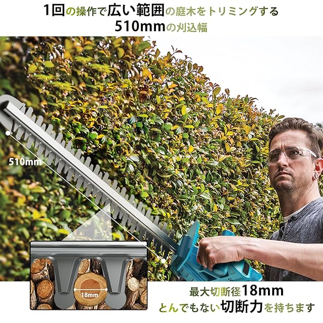 商品名:ヘッジトリマー 充電式 電動ヘッジトリマー 18Vマキタバッテリー対応可能 刈込幅510mm/切断径18mm 両刃駆動 高速往復刈り 剪定 トリマー 電動トリマー ガーデントリマー 生け垣トリマー 剪定バリカン 生垣バリカン 植木バリカン 草刈りバリカン 充電式 枝切り 電動 コードレス 軽量 【大容量バッテリー2個と充電器付属】 日本語取扱説明書