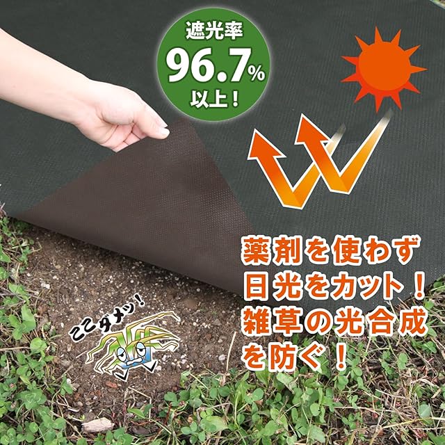 【遮光性96.7%以上】:厚みのある太い繊維が多層に絡み合った構造で強度を保持。根を張ったしつこい雑草も日光を遮断することでジワジワと成長を抑制。