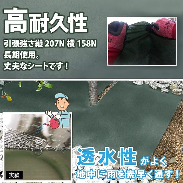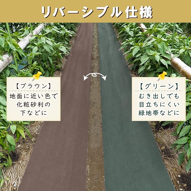 【高耐久・不織布製防草シート】:耐候剤配合の不織布製。除草剤を使わず雑草を抑制。場所によって使い分けできるリバーシブル。