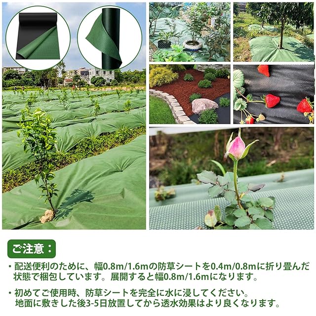 4【簡単設置・適用場所】厚手不織布なので用途に応じて自由にDIYカットしてもほつれなく、切断面も綺麗で処理不要です。幅1.6mを0.8mに折り畳んだロールで梱包しています、たたみ跡や折り目による、くぼみやたわみの心配がありません。誰でも持ち運びができて敷き方も簡単です。★幅広い用途:土を入れて簡易花壇をDIY、家庭菜園の跡地、農地の雑草対策。人工芝下、砂利の下用防草シートです。上に何も敷かない場合は「緑の面」を利用し美しくなります。周りに木や花が多い花壇などがある環境では、緑色は周囲に調和して目立ちにくいため、防草シートが敷いてあるとは分かりづらいでしょう。