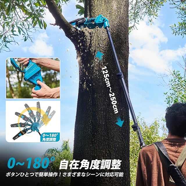 【1 台 4 役・最新 8 インチ高枝チェーンソー/剪定ハサミ】この手持ち 8 インチ高枝チェーンソー/剪定ハサミは、ポール着脱式設計で、手持ちモードと高枝モードを自在に切り替えられます。伸縮ポールは 125cm~250cm まで無段階調整可能で、最大伸長時に約 450cm の高さまで対応し、安全かつ効率的な作業を実現します。ヘッド部分は 0~180° の角度調整が可能で、果樹・木材・竹・庭木の切断など、多様なシーンで活躍します。