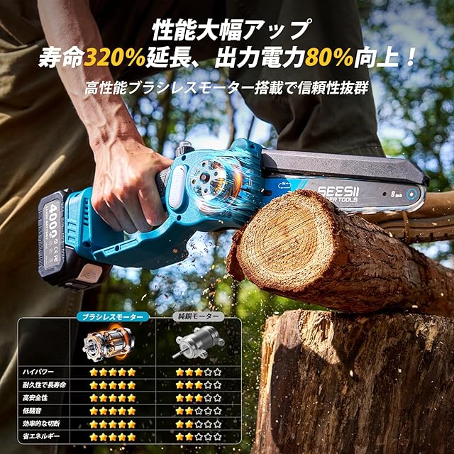 【ブラシレスモーター・高効率切断電動チェーンソー】SEESII 充電式 8 インチチェーンソー M8G は、ブラシレスモーター搭載で、ブラシ式モーター比べ、寿命は 320%延長、出力電力は 80%向上、エネルギー消費量は 50%削減します。作動時に火花発生なくモーター摩耗を抑制し、長寿命と高効率を実現します。補助ハンドルにより、直径 200mm の丸太を 10 秒で切断可能で、作業の時間と労力を大幅に軽減します。さらにオイル注入口搭載によるスムーズな給油機能で、木材・竹の切断、薪作り、庭木の剪定など多様なシーンで活躍します。