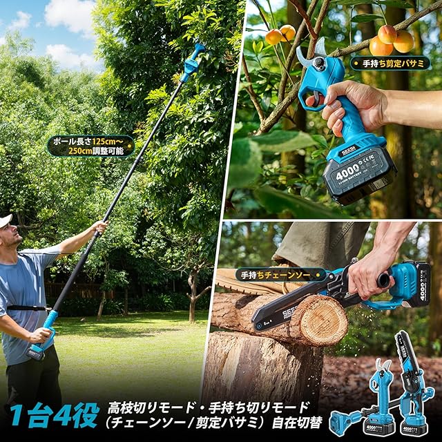 【2025年新登場】SEESII 高枝チェーンソー たかえだ 電動バサミ 8インチ 充電式チェーンソー 高枝切り剪定ハサミ 1台4役 セット 強力 電動のこぎり 軽量 コードレス ブラシレスモーター オイル注ぎ機能 延長ポール 125cm~250cm無段階調整 パワフル プロ 伐採 木工切断 庭木の剪定 4.0Ah大容量バッテリー2個付き
