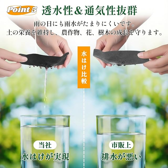 【高透水性&UV耐候性で長期間エコフレンドリー】高い密度でありながら、水は通し、空気は逃がす特殊な構造。除草シートを通して雨水や液肥はしっかり透過させるため、植物の根腐れや土壌の乾燥を防ぎます。さらに、厳選されたUV耐候剤を配合し、日本の厳しい日差しからシートを強力に保護。劣化を大幅に抑え、環境にも配慮した持続可能な雑草対策として、美観を長期的に保ちます。