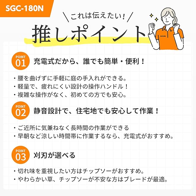 工進(KOSHIN) 18V 2.0Ah 充電式 草刈機 刈払機 SGC-180N 【本体のみ】 刈刃 2種類 チップソー 樹脂ブレード 軽量 手軽