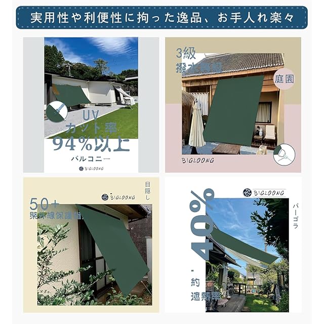 BIGLOONG 日除けシェード 日よけ 暑さ対策 雨除け撥水防水 サンシェード 400Dポリエステル ハトメ式強度UP PU塗装 紫外線UVカット ベランダ オーニング 芝生 庭園 プール 池 デッキ カイルヤード 中庭 裏庭 ドアヤード 公園 カーポート パーゴラ サンドボックス (グリーン, 3*5M)