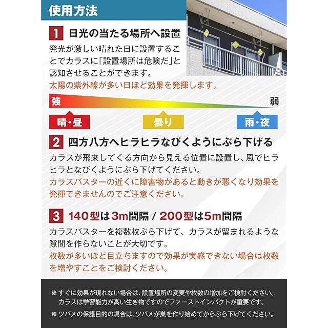 【使用方法】①必ず晴れの日から設置してください。②プレートは必ずカラスが飛来してくる方向から見える位置に設置し、360度周りの物に当たらない様ヒラヒラはびく様にぶら下げてください。③間隔の目安は140型は3m間隔、200型は5mの間隔にてご使用ください。枚数が多いほど目立ちやすくなり効果的です。カラスからツバメの巣を守る目的の方はツバメが巣を作り始めてからぶら下げてください。