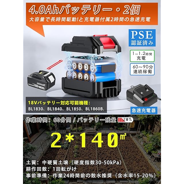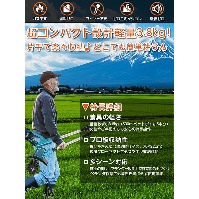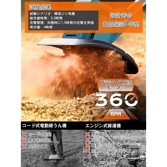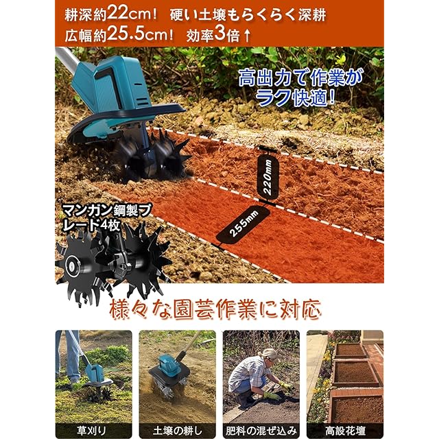 ✅【2025年最新モデル 充電式耕うん機】▼コードレスで▼軽量▼コンパクトな耕運機】家庭菜園や花壇での使用に便利なコードレスでコンパクトな耕運機です。軽量なので女性にも扱いやすいです。ご注意:本機は過熱保護機能が付いています。30 分連続使用後は、一旦使用を停止して、モーターが過熱することによる故障を防止してください。▼1回の充電で駐車場15台分の草刈りが可能。1充電あたりの作業面積目安※:42.2坪(140m2)※中硬質土壌、作業量は、バッテリーの状態と土質の種類によって異なります。