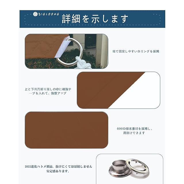 【高級素材を採用され】耐久性に優れた100%ポリエステル生地素材を採用され、 強力な縫い目と各コーナーの耐久性のあるステンレス鋼Dリング、四辺にアルミ製のハトメ付き、 設置簡単、紐6本で固定しやすい。コーナーごとにナイロンロープが付いています。