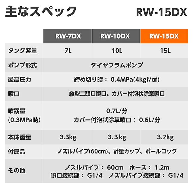 付属噴口:(消毒用)縦型二頭口噴口 (除草用)カバー付泡状除草噴口