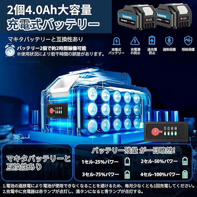 【電量表示付き4000mAh大容量バッテリー2個・マキタバッテリー対応】充電式草刈り機は、4000mAhの大容量バッテリー2個を搭載しており、バッテリーには電量表示ランプが付いており、残りの電量をリアルタイムで監視できます。フル充電後、最大2時間連続使用可能です。過充電、過放電、短絡保護機能が備わっており、安全に使用でき、バッテリーの寿命も延ばすことができます。コードレス設計により、電源コードに縛られることなく自由に操作でき、収納スペースも取らず便利です。また、マキタのバッテリーにも対応しており、利便性が向上します。