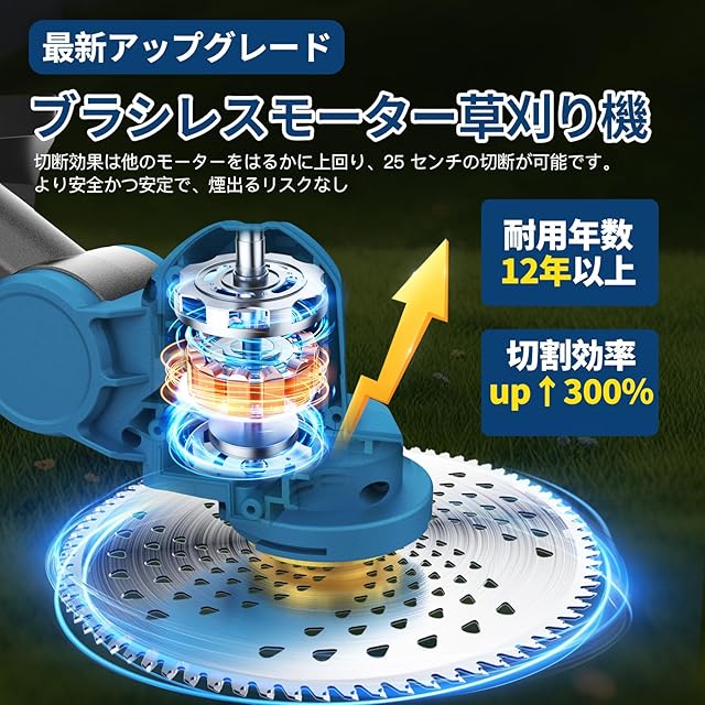 商品名:草刈り機 充電式 新しいアップグレードブラシレスモーター 4000mAh大容量バッテリー2個搭載 電動草刈機 チップソー径255mm 多い種類の刃と替刃 マキタ18v電池互換 残量表示 草刈り機 電動充電式草刈り機 角度調整 伸縮可能 軽量 低騒音 安全設計 肩掛けバンド 除草 枝切り 雑草 芝生 畑 植木 家庭用 女性でも簡単 除草 2時間運行 日本語説明書付き