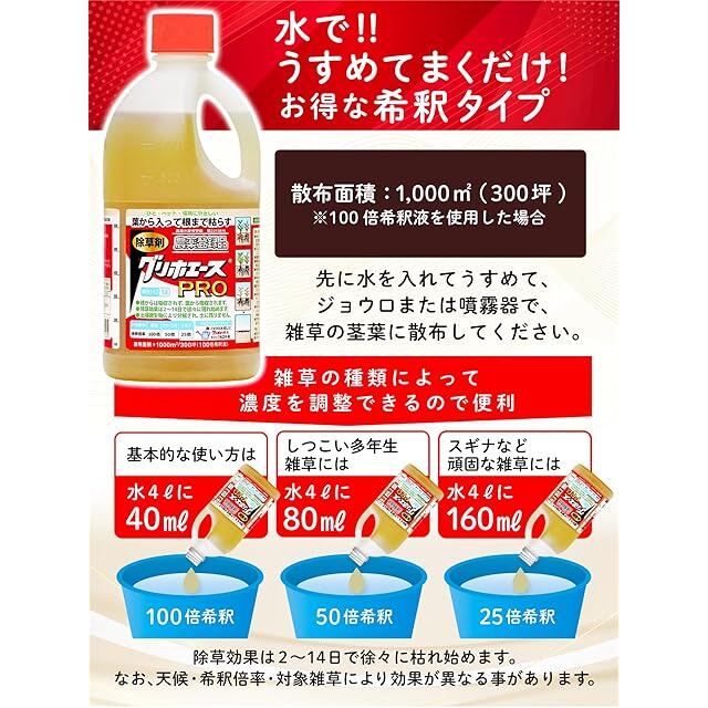 【希釈倍率の調整が可能】雑草の種類に応じた希釈倍率で使用可能。通常雑草には100倍、ササ・つる類には50倍、スギナには25倍の希釈率を推奨。