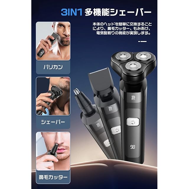 【3in1電気シェーバー·3D回転式360°】 メンズシェーバー は髭剃り、バリカン、鼻毛カッターの3つの機能を1台に凝縮した多機能モデルです。シェーバーヘッドでひげを剃り、バリカンヘッドで長いひげや体毛を整え、鼻毛カッターヘッドで鼻毛を除去できます。360°回転ヘッドの設計により、顔の凹凸に密着し、快適な深剃りや早剃りが可能です。また、肌との摩擦を軽減し、より滑らかな剃り心地を実現します。