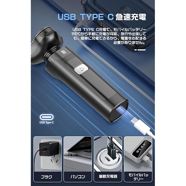 【LCDディスプレイ·Type-C充電】液晶ディスプレイを採用したこのシェーバー メンズは、充電の状態を視覚的に表示し、いつでも電池残量を確認できます。初心者でも簡単に操作でき、使いやすい設計です。Type-Cインターフェース付きのUSB充電ケーブルを使用して充電でき、さまざまな場所で充電できるので、出張や旅行、オフィスでも電力切れの心配はありません。小型シェーバー として非常に適しています。ご注意:洗濯時は充電端子(裏面金属接点)の浸水を厳禁とし、万一水分が侵入した場合は直ちに拭き取り完全乾燥後に充電操作を行ってください(※水濡れによる故障の原因となる恐れがあります)。