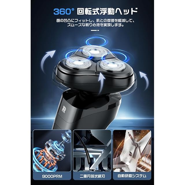 【高速回転9000rpm·自動研磨システム】 最新の高速回転モーターと極薄メッシュ刃3ヘッドを搭載した 電動シェーバーは、耐久性があり、9000rpm/分の高速回転で、1分間で早剃り&深剃りを同時に実現します。荒いひげでも簡単に剃れ、朝の時間を節約できます。自動研磨機能により、刃を頻繁に交換する必要がなく、刃の剃り心地が上がります。肌が敏感な人もスムーズに剃れます。
