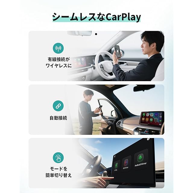 【使用簡単】面倒な接続は一切必要ありません。お使いの車両が有線CarPlayをサポートしていれば、挿すだけで接続が完了します。車側に接続する端子タイプAの場合、直接製品本体のAポートを車に挿していいです。USB タイプA to タイプC転換アダプターが付属されていますので、車側がタイプⅭの方はこれをつけて快適にご利用いただけます。そして、ミラーリングを使いたい場合、製品ケーブルのCポートをスマホに繋いで、スマホ機種に合わせて「iOS Mirror」或いは「Android Mirror」をタップするだけですぐ利用可能です。