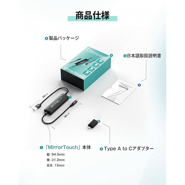 商品名:【公式】オットキャストMirror Touch Ottocast 新型 ミラータッチ スマホ画面をカーナビに映す スマホミラーリング CarPlayワイヤレス化アダプター iphoneミラキャスト カーナビからスマホの操作が可能 カープレイ無線化 接続簡単 低遅延 純正有線CarPlay搭載車適合 【技適認証済み】