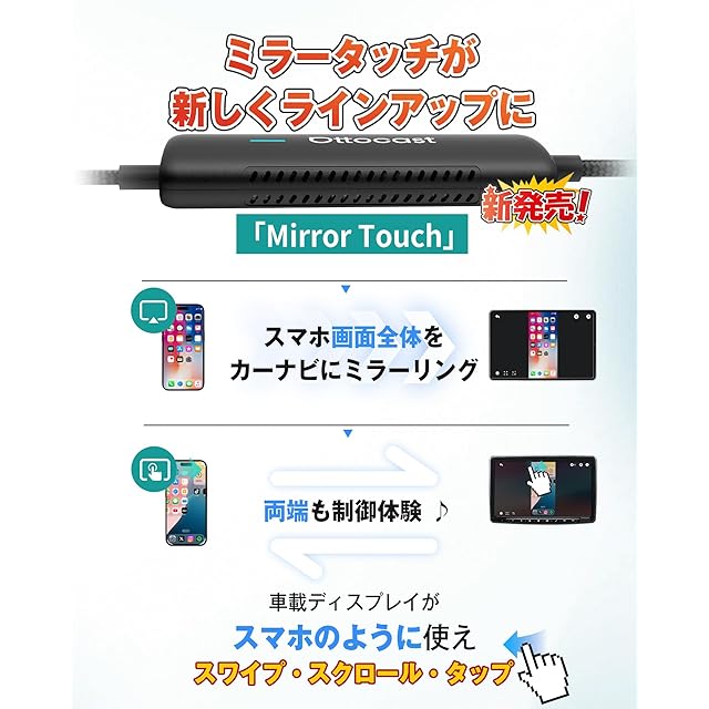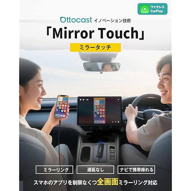 【公式】オットキャストMirror Touch Ottocast 新型 ミラータッチ スマホ画面をカーナビに映す スマホミラーリング CarPlayワイヤレス化アダプター iphoneミラキャスト カーナビからスマホの操作が可能 カープレイ無線化 接続簡単 低遅延 純正有線CarPlay搭載車適合 【技適認証済み】