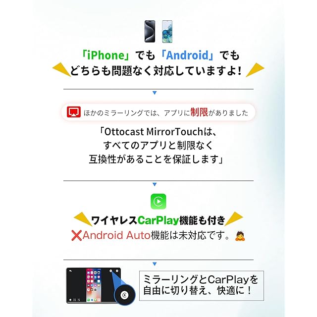 【Mirror Touchの機能】世界初の技術を搭載したOttocast mirror touchアダプターは主に三つの機能があります。1、 スマホのアプリを制限なくカーナビにミラリングできます。操作簡単且つ低遅延(人間が感じないほど80ms以内)の画面ミラリングを実現できます。 2、有線 CarPlayを無線 CarPlayに変換できます。3、ミラーリングはタッチ操作にも対応しているので、カーナビからスマホの操作が可能です。ナビで携帯操れるし、画面でスクロールもできて、カメラなども使えます。※アンドロイドスマホの方はアクセシビリティの設定をしなくてもタッチ操作可能です。iPhoneの方はアクセシビリティのZOOM機能をオンにして、三本指でタップしていただくと、車のモニターにタッチでも使えます。