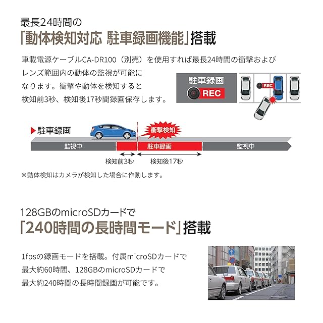 衝撃だけでなく、フロントカメラで捕捉した動体を検知する、最長 24 時間の長時間「駐車監視録画」に対応(別途CA-DR100が必要)