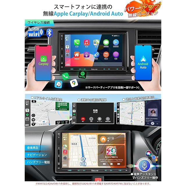 NEW!【2.4GHz WIFIとBluetooth経由の無線式にUP】KAR7はiPhone及びAndroid端末と接続することで音楽再生、電話やナビ案内などが使用できる「AppleCarPlay」「AndroidAuto」に対応します。一部の携帯アプリをオーディオ大画面に表示するのはもちろん、音声コントロール機能「Siri」「Googleアシスタント」を使用して、音楽・ラジオ再生、通話、スケジュール管理、ナビゲーション、周辺スポットのチェックなどをハンズフリーで操作することもできます。