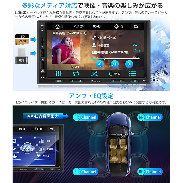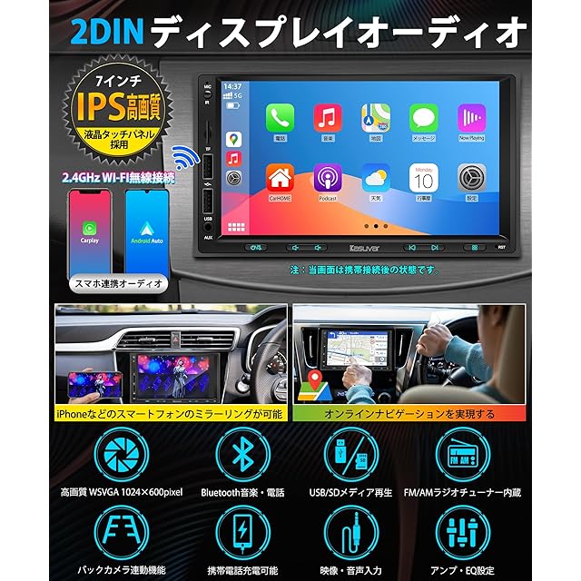 商品名:KASUVAR 2DIN 7インチ ディスプレイ オーディオ 30バンドEQ 1024×600P IPSタッチパネル FM/AMラジオ スマホ連携で無線CarPlay/AndroidAuto、Youtubeをミラーリングする バックカメラ連動、ステアリング制御、アンプ内蔵、映像出入力、USB/SD動画音楽再生可能な多機能カーオーディオ一体型車載ナビ Bluetooth5.0 技適取得【KAR7】