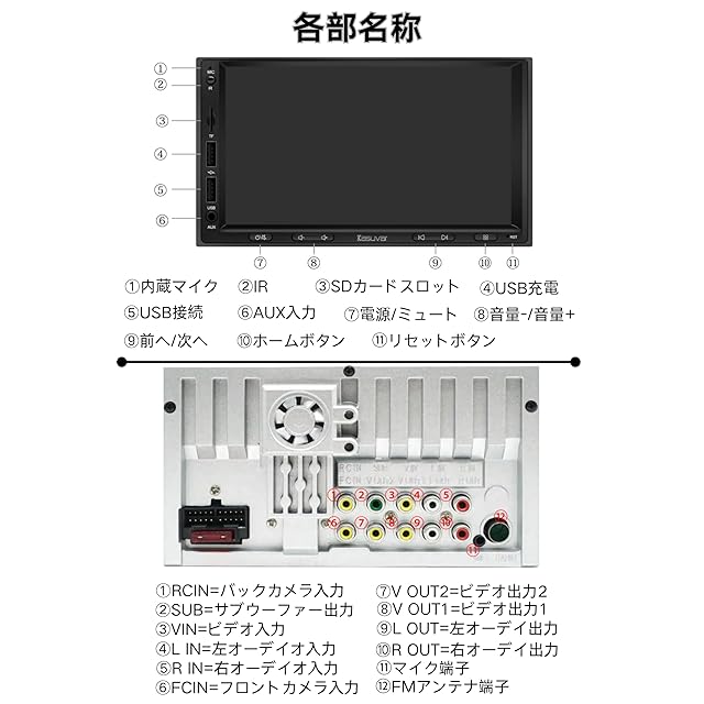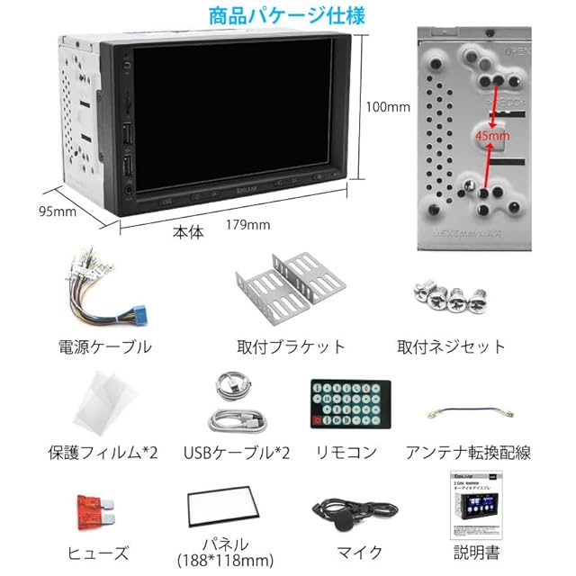 本製品仕様書:<br> 液晶モニター:7インチ高輝度IPS液晶パネル<br> 画素数:1024×600pixel<br> CarPlay/AndroidAuto:有線対応<br> Mirror Link:有線対応<br> Bluetooth:サポート<br> カースピーカー出力:FL・FR・RR・RL/RCA(FL・FR・RR・RL・サブウーハー)<br> 映像・音声入力:RCA映像2系統/音声1系統、バックカメラ用1系統<br> 音楽再生フォーマット:MP3、WMA、AAC、RM、etc<br> 動画再生フォーマット:MPEG-1/2/4、H264、H263、VC1、RV、RMVB、DivX、etc<br> サイズ:(約)179(W)×100(H)×95(D)mm<br> 電源:DC12V<br> 期間:12ヶ月<br>