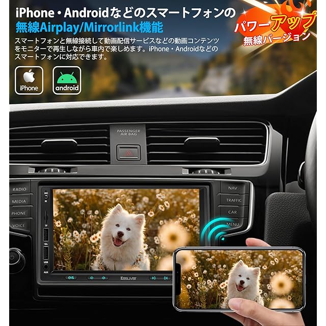 NEW!【ワイヤレスミラーリングもスムーズに】日常の移動がもっとスマートになる、IPhone/Android OSのミラーリング機能をご紹介します。画面と音声コンテンツを7インチ大画面に同期しながら車内で楽しむことができます。複雑な接続設定は一切不要!車載ナビとスマホを簡単ペアリングすれば、シンプルな操作で画面投影が可能です。自分のスマートフォンが車の大画面に飛び出してきたかのような感覚を味わえます。