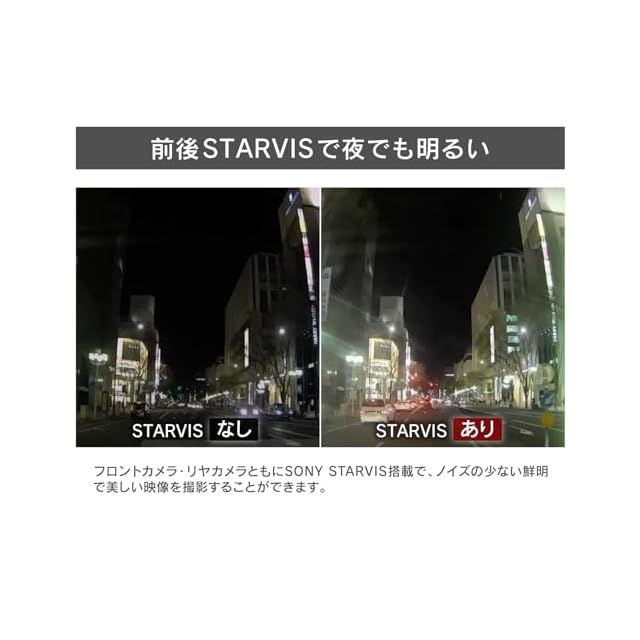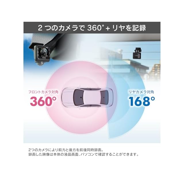 リヤカメラ部仕様:撮像素子:1/2.8型 cmosセンサー starvis技術搭載 有効画素数:最大200万画素 レンズ画角:水平138° 垂直70° 対角168° f値:2.0 レンズ材質:ガラス