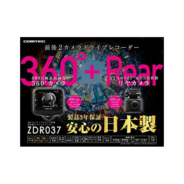 コムテック 車用 ドライブレコーダー 360度全方位+リヤカメラ搭載 ZDR037 800万画素360°カメラ全方位録画 STARVIS搭載リヤカメラ 後続車接近お知らせ機能搭載 日本製 3年 GPS 駐車監視 補償サービス2万円 COMTEC [出張取付サービス対応]