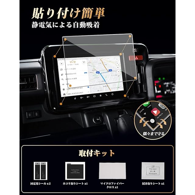 【簡単貼り付け、気泡防止設計】 付属のツールを使い、手順に従って数分で安全な画面保護を施せます。 ※気泡の原因となるホコリや汚れを取り除くため、取り付け前に画面をよく清掃してください。また、車内へのホコリの侵入を防ぐため、窓を閉めた状態での作業をおすすめします。気泡が残った場合は、軽く押し出すことで簡単に取り除けます。