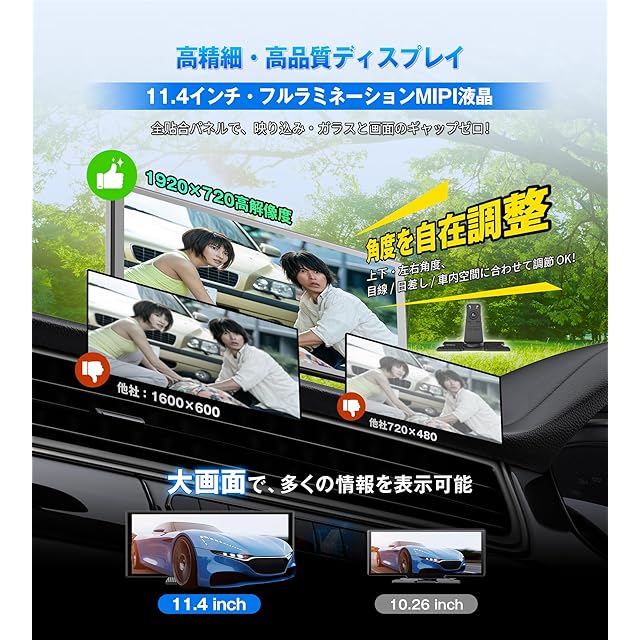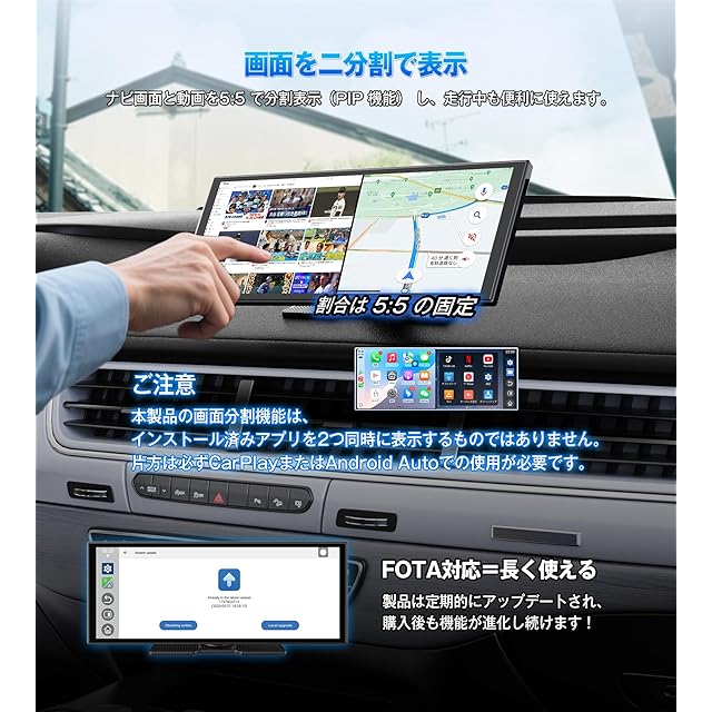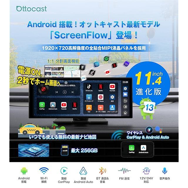 商品名:【公式】オットキャスト ポータブルディスプレイオーディオ OTTOCAST ScreenFlow 11.4インチ ワイヤレスCarPlay/Android Auto対応でYouTubeやNetflixも視聴可能 androidナビ 音楽/通話/音声操作(Siri/Google) Bluetooth/AUX/FM 2画面分割 取付け簡単 技適取得済 TFカード対応 オンダッシュモニター