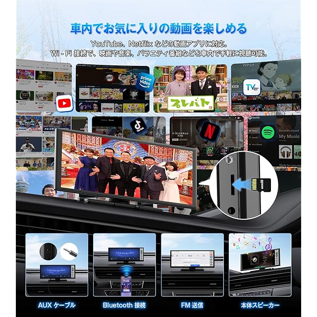 【TFカード対応&3種類の音声出力で自由な視聴体験】 ストリーミングだけでなく、TF(MicroSD)カードに最大256GBまで対応。旅行前にお気に入りの動画や音楽を保存しておけば、通信料ゼロで長距離ドライブも退屈知らず。車載スピーカーへの音声出力は「Bluetooth」「FMトランスミッター」「AUX接続」の3方式に対応しており、好みに応じて高音質の音楽体験が楽しめます。さらに、1:1の分割画面機能で、ナビと音楽アプリなどを同時に表示可能。安全運転を妨げず、ワンタッチで操作できる利便性も魅力です。