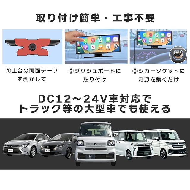 【簡単取り付け・工事不要】 本製品は、様々な車のダッシュボードに貼り付けるだけで簡単に設置できます。 ただし、設置位置(特にダッシュボードの角度や形状)によっては、取り付けが難しい場合がございます。 設置スペースや角度などをご確認のうえ、ご購入いただきますようお願い申し上げます。