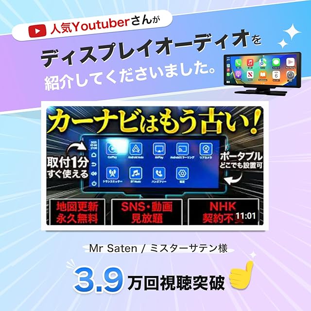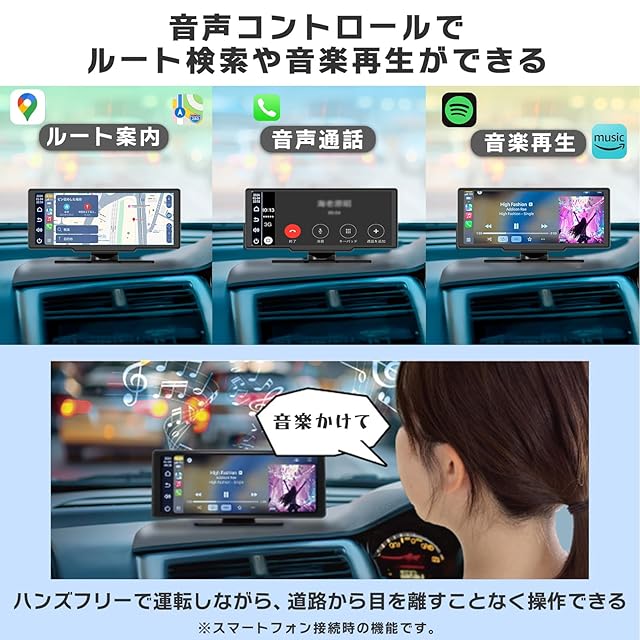 【音声操作でハンズフリー】 SiriやGoogleアシスタント対応で話しかけるだけで、地図のルート案内、電話の発信・受信、メッセージの送受信、音楽の再生などを簡単に操作できます。いつでも最新のMAPをナビゲーションアプリケーション(Google Maps、Apple Maps、Yahooカーナビなど)で確認でき、純正ナビの更新料も不要です。運転中でも手を使わずに音声で操作できるため、より安全に運転に集中することができます。さらに、Bluetooth接続、AUX入力、FM送信機能にも対応しており、様々な音声出力方法でお楽しみいただけます。
