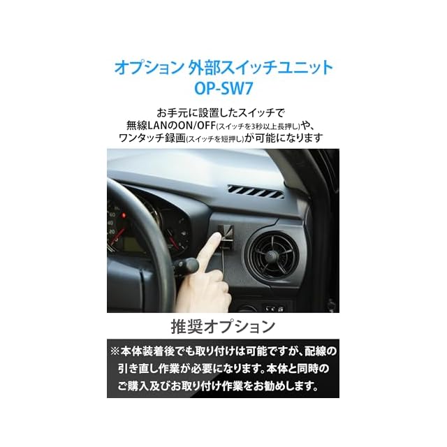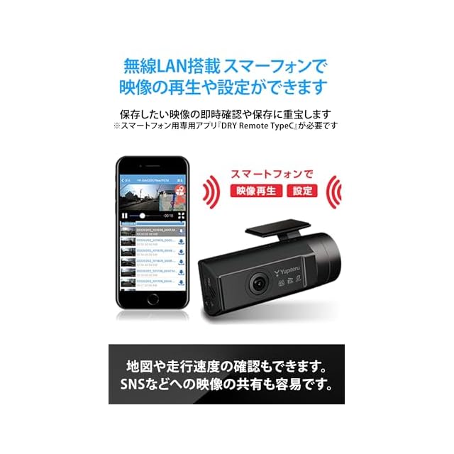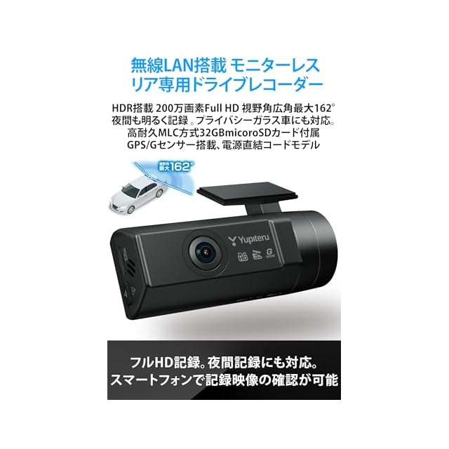 無線LAN搭載 モニターレス リア専用ドライブレコーダー。200万画素FullHD 夜間機能搭載。スマートフォンで記録映像の確認や設定が可能。