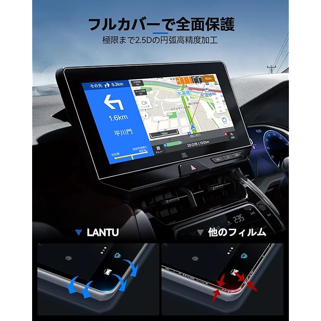 【9H硬度のナビガラスフィルム】9H硬度の素材により、外部(鍵や他の硬ものなど)からの衝撃を強化ガラスが吸収し、ランドクルーザー 250 ナビフィルム が 画面へのダメージを最低限まで抑えました。万一割れてしまった際にも飛び散らず破片は張り付いた状態になり、高い安全性を実現しています。ガラス強化フィルムが99.9%驚きの透過率をもち、液晶画面を守りながらスクリーン元々の鮮やかな画質を損なわなく、そのままに楽しみます。