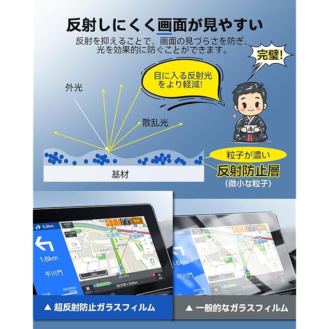 【新たに開発した「スーパー反射防止フィルム」】太陽光や周囲の明かりなどの反射によって、ナビガーション画面が見にくくなったことはありませんか。「反射防止AGLRフィルム」は特殊なAG(ハードコート)加工により、入射光を拡散することで照明や周囲からの映り込みを抑えて、画面の視認性を向上させる機能があります。また、優れた反射対抗性に加え、指紋や水などを付きにくくなり、拭き取りやすい機能を併せ持っています。AG層と、防汚機能を有したAF層の2層コーティングを積層化することで実現しています。ハリアー 80系 カーナビを傷から守る同時に、運転中の視認性を向上させます。