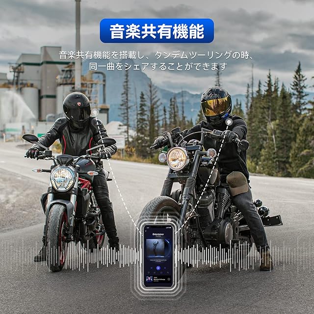 【音楽シェア機能】音楽シェア機能が搭載され、ツーリングやタンデム中仲間とお気に入りのミュージックを同時に聴くことができます(シェアリング中通話できません)。バイクインカムで二人きりの時間を心ゆくまで楽しめ、お互いの絆も一層アップさせます。