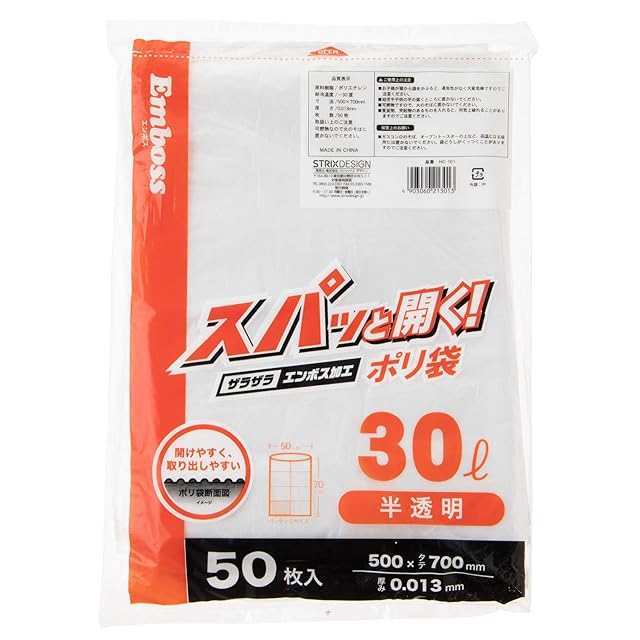 ストリックスデザイン ゴミ袋 スパッと開く! ポリ袋 30L 50枚 半透明 エンボス加工 開けやすく取り出しやすい HC-101