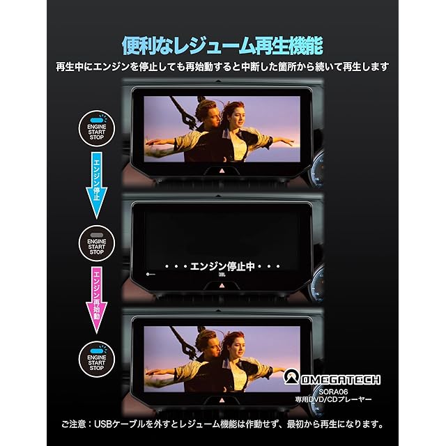●レジューム機能対応:改良版2025モデル新機能!再生中にエンジンを停止しても、再始動すると続きから再生いただけます。*USBケーブルを外すとレジューム機能は作動せず、最初からの再生になります。
