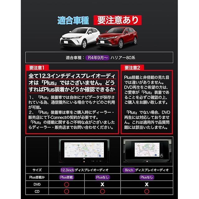 ●ご購入の注意事項とお知らせ:最近、一部のお客様から、ご自身の車両が「ディスプレイオーディオPlus」かどうか分からずに購入し、DVD再生ができないというご指摘をいただきました。ここにお知らせいたしますが、本商品は令和4年9月からのハリアーに対応いたします。12.3インチ純正ディスプレイオーディオPlus搭載するモデルはDVD・CDの再生となります。8インチ及びPlusが無いモデルはCDの再生となります。「Plus」でない場合、DVD再生には対応しておりません。これは品質問題には該当いたしません。購入前のご注意:DVD再生をご希望の方は、ご愛車のディスプレイオーディオが「Plus」であることを必ずご確認の上、ご購入をお願いいたします。