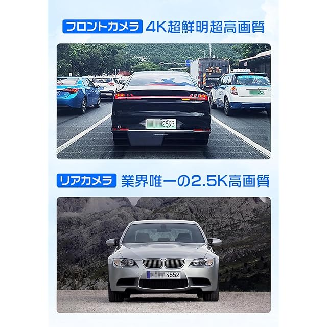 【前4K+後2.5K高画質+高感度IMXセンサーWDR/HDR+前後2カメラ同時録画】 ➊本機には4Kフロントカメラと2.5Kリアカメラが搭載されており、ナンバープレートや標識の文字など細部まで鮮明に記録可能です。特に夜間の撮影性能も強化されているので、万が一の時にはしっかり証拠が残されます。➋本機には高感度IMXセンサーが搭載されており、HDRおよびWDRの画像補正技術により、暗い環境でも鮮明な映像を記録することが可能です。曇り/雨などの悪天候や夜間でも、鮮明で美しい映像を記録!黒つぶれや白飛びを防止。夜間やトンネルで明度差のある場面でもしっかり補正して、鮮明な映像を記録します。❸前後2カメラ同時録画であなたの前方と後方をしっかり守ります。