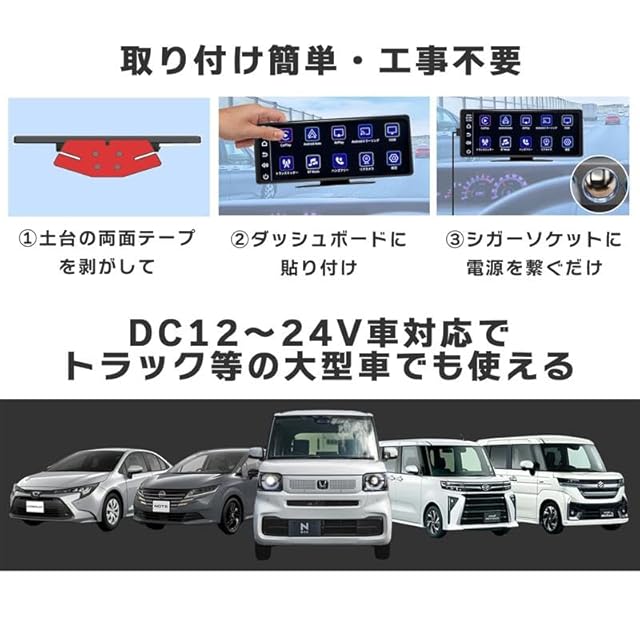 【簡単取り付け・工事不要】 本製品は、様々な車のダッシュボードに貼り付けるだけで簡単に設置できます。 ただし、設置位置(特にダッシュボードの角度や形状)によっては、取り付けが難しい場合がございます。 設置スペースや角度などをご確認のうえ、ご購入いただきますようお願い申し上げます。