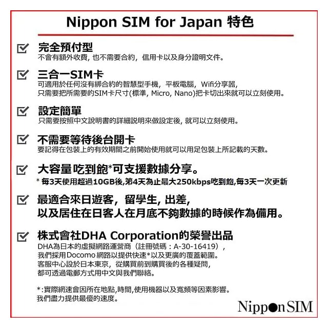 【面倒な契約なし!サポートも充実】個人認証、クレジットカード登録、契約、事務手数料等は一切不要です。株式会社DHA Corporationは日本のMVNO(仮想移動体通信事業者、届出番号A-30-16419)です。販売からサポートまでを一貫して提供しており、日本語/英語/中国語でのサポートを行っております。商品や設定方法などについてわからないことがございましたら遠慮なくご連絡ください。