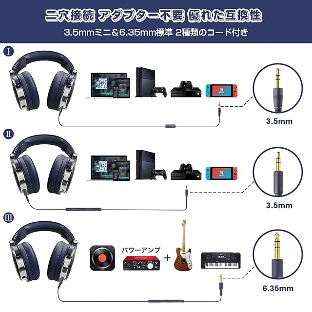 【二穴接続・音楽シェア】ヘッドホンの両側に6.35mmと3.5mmジャックが共存し、ケーブルも2本付属しております、1台の機器のステレオ音楽を複数の人と同時に楽しめる。楽器と接続した場合、パワーアンプによってヘッドホンの機能が最大限度まで再現可能。